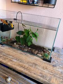 Acquario con filtro , arredo e pianta vera su tronco con due pesci rossi.