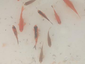 Pesci rossi e pesci incrociati tra rossi e carpe koi( una tricolor rossa e una da collezione resta rossa e corpo perlato).