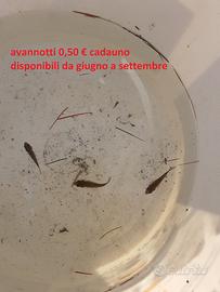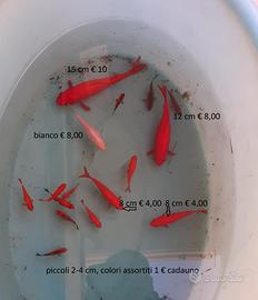 Pesci rossi (carassi) nati e allevati in laghetto esterno di varie tipologie e colore. Pesci molto resistenti anche alle basse temperature e grandi mangiatori di larve di zanzare. I pesci sono disponibili di diverse dimensioni (da avannotti nati quest'anno del classico colore bruno a pesci adulti). I prezzi variano variano da 0,50 cent per gli avannotti a 30 euro per i pesci adulti di colorazioni particolari ( rosa, bianco e rosso, pesci rossi cometa). Adatti a laghetti e mini pond esterni ma anche ad acquari. Non si effettuano spedizioni, solo consegna di persona. Disponibile anche mangime in scaglie.