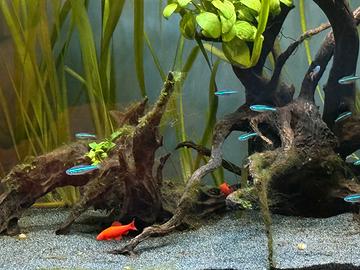 Regalo 20 "neon"/ 3 barbus titteya super red/ 2 garra flavatra/ 1 rinelorocaria sp. Red/ 1 sewelia lineolata, tutti pesci vivaci, colorati e in salute.