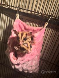 Petauri dello zucchero Wendy e Peter hanno quattro anni coppia già riproduttiva,accettano anche il contatto umano con cautela verso le persone che non conoscono hanno un carattere comunque curioso) Verranno ceduti solo in coppia con Gabbia accessoriata all'interno ci sarà bisogno solo di comprare una ruota adatta a loro. Fornirò poi il link dove comprarla. Sono animali prevalentemente notturni, ma col tempo si abituano anche agli orari della famiglia devono stare a una temperatura tra i 18 e i 24° loro seguono un'alimentazione particolare la fresh diet, ovvero Frutta E Verdura insetti e integratori calcio,gomma arabica, polline, (fornirò anche di questo il sito dove poter acquistare queste polveri e una tabella indicativa sulla somministrazione, )Attenzione non tutta la frutta e verdura va bene fornirò una lista con le verdure e la frutta adatta a loro. Gli insetti sono facili da reperire e si trovano anche in un negozio di animali o si possono acquistare online.