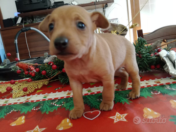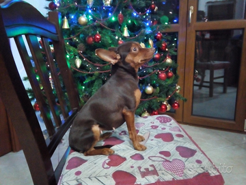 Salve, si cede ultimo cucciolotto di pincher miniatur, di color rosso cervo, di taglia piccolissima, da adulto peserà non più di 3 kg, si adotta dopo 3 mesi di vita, con 3 cicli di sverminazione, a cadenza di 15 giorni, sia il papà che la mamma, sono visibili sul posto e di mia proprietà.