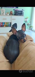 Pinscher toy femmina , nero focata , sei mesi di età, non sterilizzata , molto affettuosa con tutti e vivace , microcippata , 5 vaccini , 5 sverminazioni e un ciclo antipulci fatti , quindi " perfettamente in salute " da come si evince anche dalle foto ! Lunghezza 30 cm , altezza 20 cm , peso 1300 gr. ( dovrebbe raggiungere circa 2 kg ) . A malincuore e per sopraggiunte questioni lavorative cerchiamo nuovi padroncini , preferibilmente con figli e magari un giardinetto , che riescano a dedicargli il tempo e le attenzioni che merita e che al momento purtroppo fatichiamo a dargli . Il cane è stato abituato in appartamento e con traversine , ma usciva anche all'aperto ( 1 volta al giorno perchè questi mesi era abbastanza freddo e loro lo soffrono molto ). Contattateci solo se veramente interessati e vicino alla zona di Como x un eventuale incontro . Grazie ... Andrea / Mery ...
