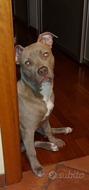 Vendo pitbull femmina di 6 mesi, vaccinata . È un bel cane, buona e affettuosa, manto color tortora e meravigliosi occhi verdi. Contattatemi solo se potete occuparvene con tanto amore. Lei vive e dorme con la sua umana. Purtroppo non possiamo più tenerla.