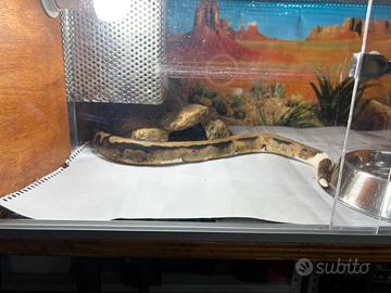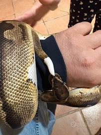 pitone real mutazione pied clown di circa 2 e anni e mezzo, lunghezza 1 metro circa e piú di 1 kilo di peso. Cedo anche terrario accessoriato di lampada in ceramica 100W, tana exoterra,termostato e luce normale. Per il terrario e serpente con accessori 450€.Solo serpente 250€. PREZZO AFFARE!!