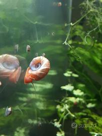 Vendo in porzioni da 10 esemplari lumache del tipo planorbarius red, adulte e subadulte, da acqua dolce, non attaccano le piante, ottime mangia alghe, utile aiuto per tenere puliti i vetri.