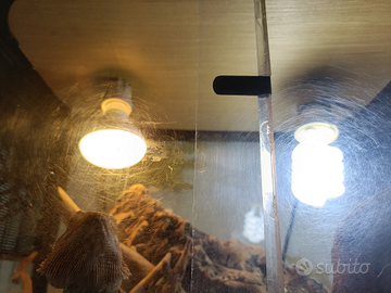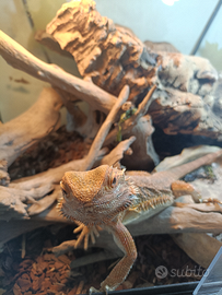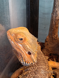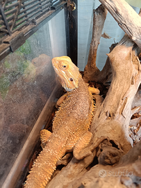 La pogona è una femmina, ha 4 anni ed è mezza Red(madre) e mezza Ancestrale(padre). Abituata al contatto con le persone, è molto docile. Mangia soprattutto insalata, fruttine gel e ogni tanto grilli e tarme della farina. Vendo con tutto il rettilario che ha dimensioni 60x40x40. Questo rettilario però mi arrivò con 2 vetri rotti e gli sportelli scorrevoli rotti, che ho riparato con il plexiglass. Ho anche un rettilario da 80cm in vendita, nel caso si voglia quello, ci mettiamo d'accordo. Vendo solo su Roma e dintorni con consegna a mano, per il bene della pogona e per non fare rompere il rettilario dagli spedizionieri. Non necessita di certificazione