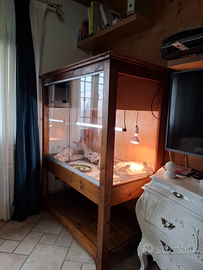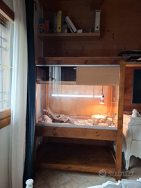 La teca è allestita con cavo riscaldante con termostato digitale, neon uvb e lampada riscaldante 150 w. Compreso di tutto l'allestimento di tronchi, pietre e sassi e mangiatoia . Diamo anche lampada di scorta calcio e vitamine .