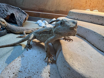 A mio malincuore mi vedo costretto a vendere i miei draghi barbuti per motivi lavorativi. Sono due femmine e un maschio di 3 e 4 anni. Una femmina integra e il maschio e una femmina sono senza una zampetta così dalla nascita,ma in ottima salute. Vendo anche allestimento in grande teca di legno e vetro (h170L130Profonda71,5)