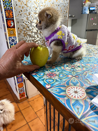 Un Pomerania maschio (Pomchi). Un incrocio tra un Chihuahua e un Pomerania è in vendita. Ha tre mesi. È intelligente come il Chihuahua della madre e giocoso come il Pomerania del padre. È vaccinato, controllato dal veterinario e sverminato. Il suo pelo sarà più corto di quello di un Pomerania, ma perderà molto meno pelo di un Chihuahua. Peserà 1,5 chilogrammi. È disponibile un video del cucciolo e dei suoi genitori.
