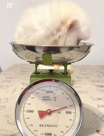 DISPONBILE da nostro allevamento; cucciolo di POMERANIA MASCHIO (spitz tedesco taglia nano) sesso maschile colore bianco TOTAL WHITE, 2 mesi e 20 giorni di vita per un peso attuale di soli 410gr dimostrabile con specifico video.