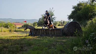 Stupenda pony Mayara, femmina di anni 10, altezza al garrese 147 cm, iscritta FISE, ottima per gare di salto ostacoli fino a 110 cm, testata anche in cross country fino a 90 cm ed adatta a riprese di dressage categorie E, buona nche in scuola, facile gestione da terra, ottimo carattere.