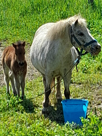 Vendo pony femmina di anni 9 con puledrino di 2 mesi domata a sella brava vendo x mancanza di tempo