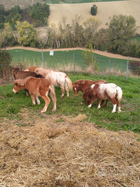Disponibili questi pony maschi nati dal mio allevamento. Appena svezzati. Hanno 6/7 mesi circa. Altezza da adulti 80-90 cm al garrese. Regolarmente con documenti e microchip. Mangiano erba e fieno.