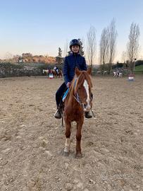 Alta 117 cm,pony fantastica,super affidabile,adatta a scuola ma anche competitiva;attualmente impegnata nelle discipline western ma adatta anche al salto ostacoli o a ponygames.
