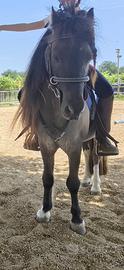 Pony castrone del 2010 h90cm sempre impegnato nella scuola. Adatto a prime messe in sella, bravo nel lavoro a corda e perfetto per bambini con un po' di esperienza (in passato ha partecipato a gare ludiche di derby country)