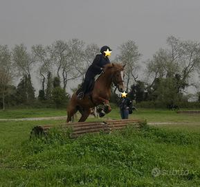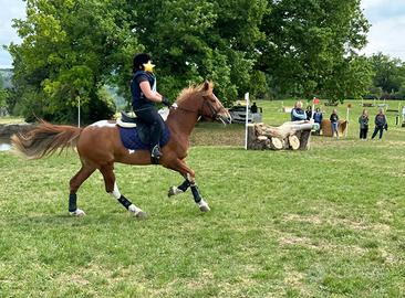 AB ZOOM IND Pony sportivo , altezza 147, anni 8, mantello tobiano sauro. Passaporto APA , iscritto Fise. Volendo completo di attrezzatura