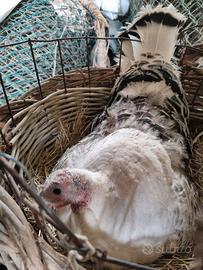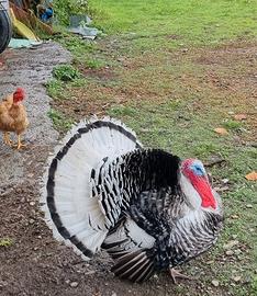 Scambio o vendo pulcino di tacchini Ermellinati di Rovigo a partire da 12 Euro /cad. Il tacchino ermellinato di Rovigo è una specie avviata sul finire degli anni 50' presso la stazione sperimentale di pollicoltura di Rovigo, allo scopo di migliorare le prestazioni del comune tacchino sotto il profilo produttivo ed economico. Per ottenere questa razza è stato introdotto nel corredo del comune tacchino italiano sangue proveniente dalla razza americana del Narragansett, che a sua volta era stata ottenuta incrociando il tacchino selvatico statunitense (patria d'origine di questo animale) con quello domestico europeo. Le caratteristiche morfologiche di questo tacchino lo pongono come animale di taglia media all'interno della sua famiglia, con i maschi che raggiungono i 10-12 kg di peso e le femmine che oscillano tra i 4 kg e i 6 kg. Sotto il profilo dell'alimentazione non si dimostra difficile da accontentare: notoriamente il tacchino è un buongustaio che si nutre di quasi tutto ciò che trova, ma nel caso dell'ermellinato siamo anche di fronte ad un abile cacciatore, che ha tra le sue prede preferite insetti di vario genere: cavallette e piccole serpi che si possono trovare in campagna. La maturità sessuale dei giovani tacchini si raggiunge in un tempo quantificabile in circa 7 mesi, sia per i soggetti maschi che per le femmine.