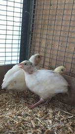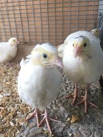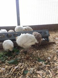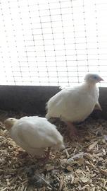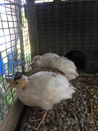 Dispongo pulcini di venti giorni di quaglie da carne e uova jumbo texane bianche trasferite in ampia gabbia senza l'ausilio di lampada e chioccia artificiale (fra due settimane sono adulte).