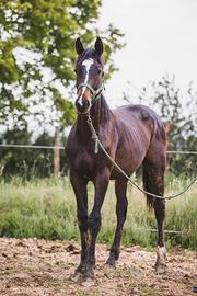 Baio scura, brava a mano, legata, da i piedi; struttura moderna futura 1.70 circa