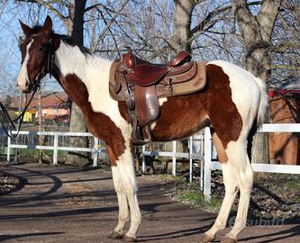 Proponiamo cavallo pezzato di 3 anni, senza paure, dal carattere dolce e collaborativo, molto facile da gestire sia da terra che montato.