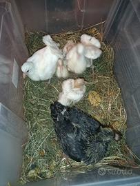 Pulli o novelli allevati a mano super domestici stanno sulla spalla mangiano dalla mano ecc.. disponibili di diverse razze.. pavoncelle,chauchois,ricciuti,sottobanca, California,king a partire da 30€ zona Saluzzo solo ritiro a mano