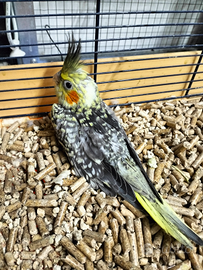 Pullo di calopsite perlato abituato al contatto umano prende ancora la pappetta nutribird quasi svezzato