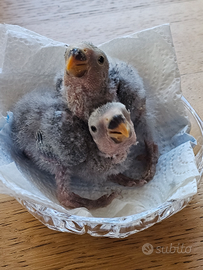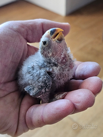 Pullo di pappagallino inseparabile, pronto per imbecco. Da genitori blu e bianco
