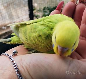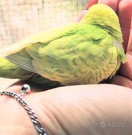 Pullo di cocorito dal bellissimo colore verde fluo da allevare a mano. Disponibile da subito Disponibili anche tanti altri colori e varie nidiate di diverse date di nascita Prezzo 25,00 euro