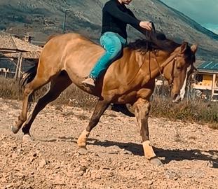 Vendo a malincuore per impegni universitari, castrone Quarter, anno 2009, documenti A.I.A. e bollettone di monta, basi reining ma utilizzato solo per passeggiate, abituato a stare sia in box che in paddock, cavallo serio e super equilibrato, zero paure, mai fatto una scortesia, esce in passeggiata sia solo che in gruppo senza problemi, mai calciato, abituato alla tosatura, al traffico, clacson, camion, tombini, passaggio a livello, corsi d'acqua, cani, ecc.. gode di ottima salute, cavallo adatto a tutti. Astenersi perditempo e affaristi, chi è veramente interessato mi contatti telefonicamente e manderò altre foto e video.