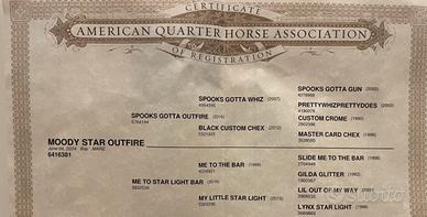 Quarter Horse 2yo, indole molto equilibrata e ottimi movimenti, iscritta irha e futurity! Attualmente in inizio addestramento presso noto trainer. Cavalla Sana, lastre disponibili per visione. Figlia diretta di Spooks Gotta Outfire X Grays Starlight. No perditempo o affaristi. Info e prezzo in privato