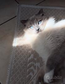 È un Ragdoll blue mitted ha poco più di 2 anni e mezzo, ha il microchip ed è sterilizzato. È un gatto che ha bisogno di compagnia è un chiacchierone e gli piacciono le coccole va d'accordo con gli animali e i bambini, è molto paziente ed è abituato a fare i bisogni fuori. Inclusa la lettiera e ciotola per il cibo