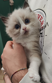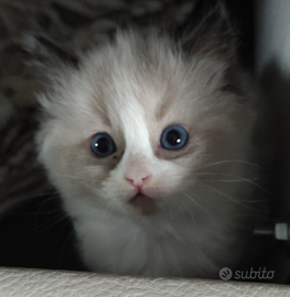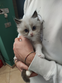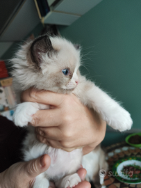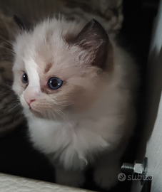Questa cucciola Ragdoll è nata il 21 novembre e sarà pronta a raggiungere la sua nuova famiglia a tre mesi con primo vaccino, microchip termico, doppia sverminazione, già abituata all'uso della lettiera e avviata all'uso del tiragraffi. Vive in famiglia con i suoi genitori e i suoi quattro fratellini. È alimenta con cibo delle migliori marche e circondata da coccole e amore che ne potenziano la naturale socialità . Si richiede per lei una famiglia che saprà amarla come merita e che garantirà foto del suo percorso di crescita. Se interessati potete contattarmi anche su WhatsApp al numero 3922462606. Monica