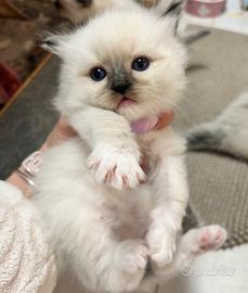 Disponibili cuccioli ragdoll seal mitted con Pedigree. Ancora liberi 2 maschietti e una femmina. I cuccioli saranno pronti per fine maggio. Avranno tutti Pedigree Enfi riconosciuto dal Ministero, libretto sanitario con doppio vaccino, certificato di buona salute Veterinario, contratto di cessione, garanzia, passaggio di proprietà e starter kit. Assistenza post adozione. NON rispondo a messaggi di solo richieste prezzo. Love Infusion Ragdoll di Gatteo (Emilia Romagna) Madre dei cuccioli Love Infusion Lorsetta Sui social Fb e Ig: Love Infusion Ragdoll