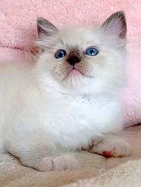 Splendido gattino Ragdoll blu mitted nato il 21 luglio 2025 sarà disponibile vaccinato con microchip e pedigree ministeriale da fine ottobre, presso allevamento riconosciuto. Il suo carattere è molto docile e lo rende un ottimo esemplare da pet therapy ideale per famiglie o persone anziane.