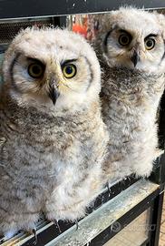 Esperti in falconeria e addestramento al volo libero cedono piccoli pulli di gufo Virginiano subartico anellati e con regolare documentazione Cites, possibilta'di corso per neofiti di gestione, alimentazione e volo per vedere i video cercare Alex falconeria e addestramento su tutti i social
