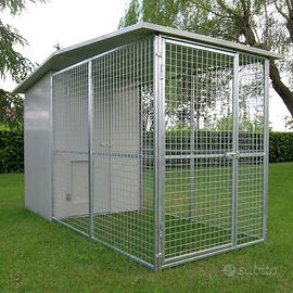 Il box per cani mod. Modulare è costituito da una zona notte in pannelli isolanti, spessore 3,5 cm, incorniciati con profili lamiera, facilmente disinfettabili e lavabili; completa di porta, gattaiola a saracinesca e pedana in legno rialzata da terra, estraibile e lavabile, una zona giorno realizzata con pannelli in rete, maglia 5 x 5 filo 0,39 zincati a caldo; completa di cancello con catenaccio portalucchetto (si può ingrandire aggiungendo ulteriori pannelli)