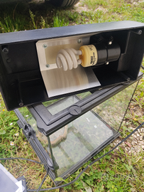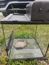 Rettilario 30 x 33x 30 lampada sopra con ingombro di circa 10 cm. Disponibile anche tappetino riscaldante da porre sotto il rettilario. Tutto funzionante.