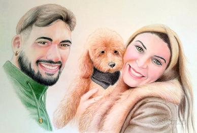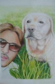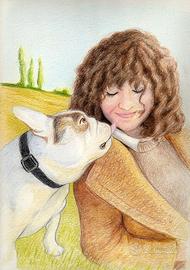 Ritratto di animali insieme ai loro padroni, disegno a matite colorate professionali (Prismacolor, Polychromos, ecc.) su cartoncino 160 o 200 gsm, formato A4 30 euro. Altri formati disponibili. E' possibile anche combinare più foto. Lavorazione max una settimana con frequenti aggiornamenti. Ritiro gratis o spedizione in Italia (circa 7-8 euro).
