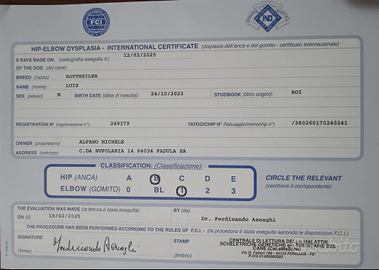 Disponibile per nuovo proprietario Rottweiler alta genealogia di 2 anni con lastre ufficiali riportate sul pedigree,Jlpp e DNA , stallone già messo in riproduzione con più accoppiamenti effettuati.Padre: Monster Timit-tor /Madre: Ruby figlia di Eminem vom Haus edelstein.