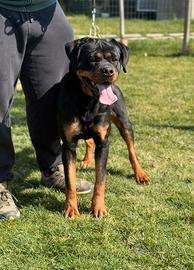 Femmina di Rottweiler di 15 mesi con pedigree Enci. Esente da ogni tipo di patologia e displasia (lastre in lettura). Ciclo vaccinale completo. La cagna non ha nessun tipo di problema,ha partecipato a gare di bellezza e si è sempre qualificata tra i primi tre posti. Molto socievole e giocherellona. Per info contattatemi .