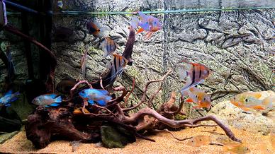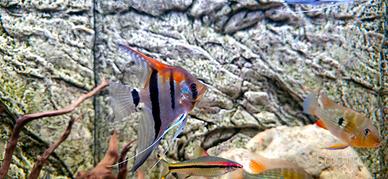 Vendo per fare spazio in vasca 5 splendidi esemplari di scalari manacapuro tra cui una coppia riproduttiva "testimonianza con video" I pesci sono grandi quasi 20 centimetri cadauno. I pesci mangiano di tutto e sono abituati in acqua di rete. No specularori no sognatori!