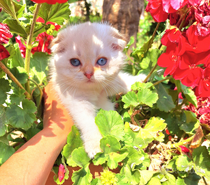 Meraviglioso e dolcissimo Scottish Fold cerca la sua famiglia definitiva.Il suo colore e' seal golden pointi ed e' un maschietto.Verra" ceduto a fine luglio quando ricevera' il secondo vaccino.Intanto verra' svermjnato e sara' consegnato con microchip e pedegree e contratto di cessione per animali da compagnia. E' abituato al contatto e al gioco, usa gia' la lettiera e il tiragraffi. I nostri cuccioli vengono allevati in casa per cui risultano molto docili e affettuosi.I genitori sono testati per le malattie infettive e genetiche.