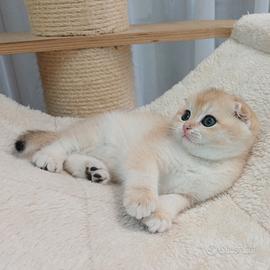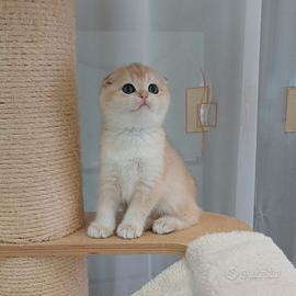 Cucciolo di 2 mesi e 15 giorni maschietto Scottish Fold colore Black Golden Shell, con Pedigree AGI, figlio di genitori che partecipano alle varie EXPO. consegnabile a partire dal 28 Aprile, cedesi con contratto da compagnia, con obbligo di sterilizzazione. I nostri cuccioli vengono consegnati con Pedigree AGI, Certificazioni PKD e Fiv-Felv negativi dei Genitori. Certificato di buona salute del veterinario ed esame delle feci eseguito una settimana prima della consegna. Libretto sanitario con doppia vaccinazione e sverminazione, Microchip già inserito. Inoltre viene consegnato un kit alimentare x le prime settimane, giochi e vitamine. Ma sopratutto con la consulenza x tutto il tempo necessario ad un corretto inserimento nella nuova famiglia.