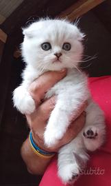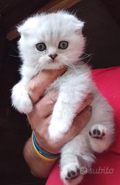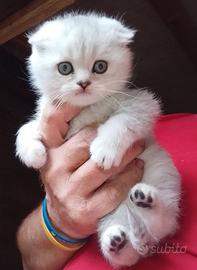 Vendo questa meravigliosa gattina di due mesi di età di scottish fold silver tabby,con occhi verdi. Genitori visibili di mia proprietà esenti filv felv e pkd Gattina di straordinaria tipicità e bellezza, perfettamente abituata al uso di lettiera e tiragraffi. Dolcissima, intelligente,molto affettuosa. Sarà ceduta alla fine dello svezzamento,(primi di maggio..),completa di libretto sanitario trattamento antiparassitario e sverminazioni.. È attualmente visibile e prenotabile.. 371-36-41-057 Wathsapp o chiamate