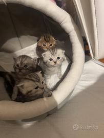 Disponibile 4 gattini nati a metà gennaio da madre Scottish fold e padre Scottish straight. Carattere dolce affettuoso nate da noi in un ambiente famigliare. Saranno in consegna, dopo svezzamento a due mesi, corredate di libretto sanitario che ne attestano il buono stato di salute, inclusi con il primo vaccino. Entrambi i genitori testati filv e felv. Per maggiori informazioni contattami 3444696157