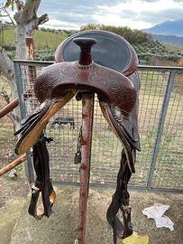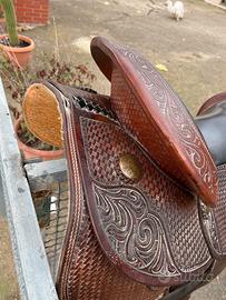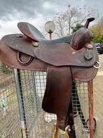 Sella americana di ottima qualità. Pagata molto di più! Pari al nuovo. Arcione full quarter misura 16. Disponibile per qualsiasi prova o spedizione