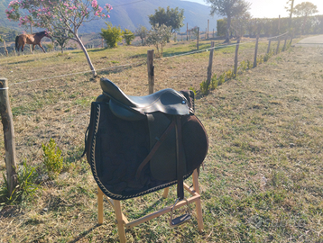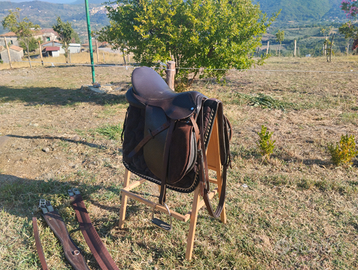 Vendo x inutilizzo ,sella inglese in vero cuoio marca Tosoni selleria completa di staffe,staffili,sottosella,2 sottopancia di cui uno in neoprene,pettorale e martingala,il tutto ? 300,00.p.s.Valuto anche scambio con sella americana misura 16".