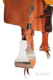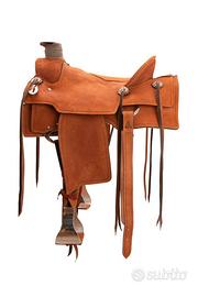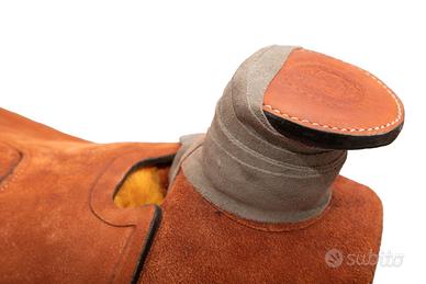 Sella Western professionale modello WADE di straordinaria bellezza realizzata in collaborazione con Fender Saddle, realizzata in esclusivo cuoio rovesciato da 5 mm c.a, design tradizionale Buckaroo saddle, seggio con inserto Bike Pad realizzato in pelle rovesciata gonna quadra, anelli e fibbie in acciaio inox, staffe in alluminio a panca larga modello Bukaroo da 5", sella bilanciata e comoda sia per il cavallo che per il cavaliere. Bella indistruttibile e ben rifinita nei particolari, equipaggiata con i nostri arcioni Strong Horn in Fibra di Vetro leggeri, resistenti, indeformabili, garanzia sull'Arcione 5 ANNI Misure disponibili 16" 17" Gullet Q peso della sella SOLO 11 Kg c.a.