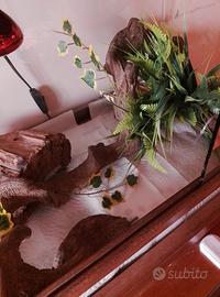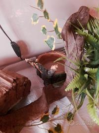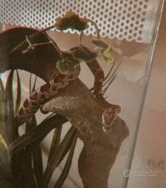 Serpente del grano di un anno, non ho voluto sapere il sesso, quindi da noi chiamato "Bobbi", tranquillo e abituato ad essere maneggiato, mangia un topolino primo pelo (costo 2 euro l'uno ) a settimana esclusivamente fuori dalla teca, nel suo trasportino. Misure teca: larghezza 51 cm, lunghezza 36 cm, altezza 44 cm, al momento sta tranquillamente sul comodino in salotto. Da prendere solo di persona, la teca pesa un po' ed è già allestita con una liana finta (per evitare che mangi le foglie), una grotta dietro cui passa la maggior parte del tempo e una ciotola dell'acqua, nonché la lampadina. ADATTO A NEOFITI